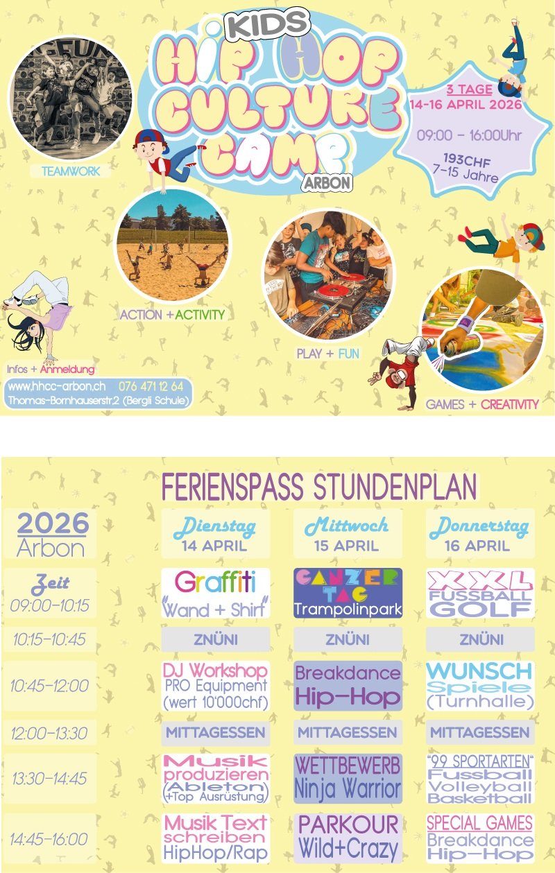 Lerne die 4 Elemente der Hip Hop Kultur mit Michel Stalder, 5-facher Schweizer Meister und ‘‘Roger Federer‘‘ des Breakdance kennen und noch vieles mehr: Graffiti: Sprayen auf ‘‘Wand‘‘ und T-Shirt, DJ: Mixe Musik und beherrsche Übergänge und Effekte wie ein Profi, Hip Hop & Breaking (Break Dance) Tanzen, Rap: Texte Schreiben